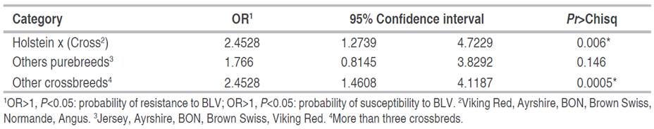 In the case of EBL, it has been found that the molecular prevalence of the virus is lower in BON compared to data from pure breeds (Herrera et al. 2011; Úsuga-Monroy et al. 2018b). The heritability of this susceptibility factor to the bovine leukemia virus infection among Holstein and Jersey cattle populations has also been estimated at 8%, indicating that genetics plays an important role in the incidence of BLV in different cattle breeds (Marawan et al. 2021). In order to analyze the breed factor, several categories were combined to determine whether or not the racial factor has an influence on BLV infection. These results can be a precedent for later studies where this hypothesis was evaluated in depth. It should be noted that the results obtained on the prevalence of BLV in the specialized dairy in Antioquia for the different racial components are not sufficient to make comparative statements between susceptibility/resistance to BLV infection due to the number of individuals for some breeds. However, to establish the association between the breed and the presence of BLV, the following groupings were made: Holstein x Cross, others purebreds and other crossbreeds and compared with the Holstein breed (Table 3). It was identified that the racial component (Holstein x Cross and other crossbreeds) does influence the probability of not having BLV infection (P<0.05) compared to the Holstein breed. Therefore, these results show a trend that generates the hypothesis that there may be breeds with greater resistance to infection by the virus in the Antioquia dairy, however, our data do not allow us to establish individually which breed or breeds are more resistant to BLV infection.