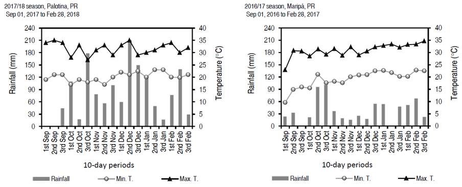 Two experiments (1 and 2) were conducted in a production area in the western region of the state of Paraná (PR), Brazil. Experiment 1 was conducted in the 2017-2018 growing season at two locations in the municipality of Palotina (A: 24°18'44" S 53°44'36" W, B: 24°20'50" S 53°51'38" W), and experiment 2 in the 2016-2017 growing season at a location in the municipality of Maripá (24°23'21.6''S 53°45'47.3''W). The prevailing climate of the region is Cfa (subtropical, with hot summers), by the Köppen classification. Figure 1 illustrates climatic data during the experimental period.