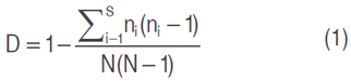 Where S is the number of species present, n is the density of each species and N is the sum of the densities of all species.