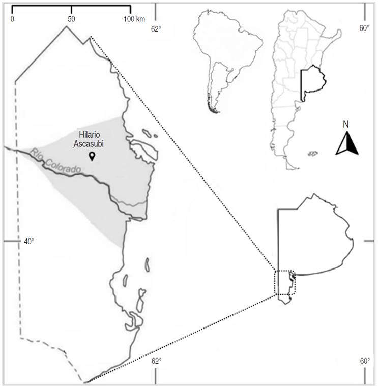 The VIRC has a semiarid temperate climate, with an average annual temperature of 15 °C and sandy loam-textured soils with 1% organic matter (Trillini et al. 2023). The average annual rainfall is around 500 mm with a significant water deficit condition; hence an adequate irrigation system is crucial to produce horticultural crops (Trillini et al. 2023). Two complementary experiments were carried out in an irrigated plot at the INTA-Ascasubi Experimental Station (39°23'31.8"S-62°37'43.8"W), Villarino, Buenos Aires province, Argentina (Figure 1). In these experiments, the floristic composition and weed emergence were quantified in a garlic crop planted under CT or 0T. Experiment 1 took place in 2017 where the emergence of AWS and AWS-SS weeds was counted, while experiment 2 was carried out in 2019 recording the emergence of SS and AWS-SS species.