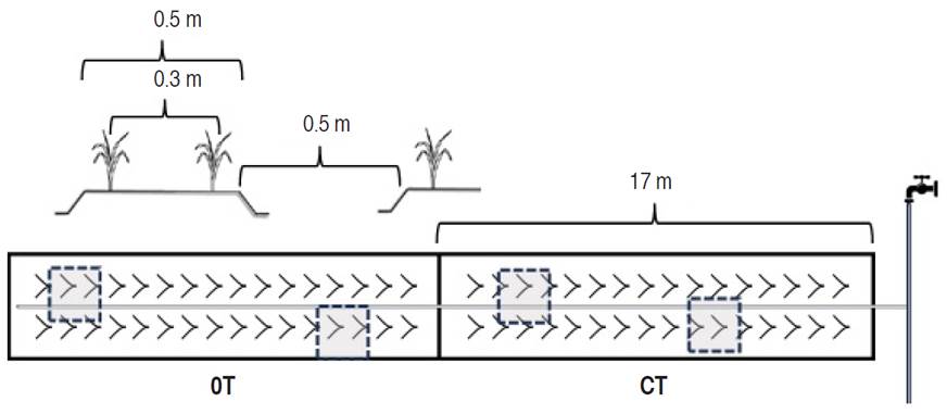 Prior to each experiment, sowing of Vicia villosa Roth was carried out to homogenize the soil seed bank. For each experiment, a randomized complete block design with two treatments (0T and CT) and six replicates (N=12) was performed. Garlic seed-cloves were planted manually at the beginning of May following a spatial planting arrangement in two-sided furrows considering each furrow as a block (Figure 2). The planting density was 20 seed teeth per linear meter at a depth of approximately 8 cm. Garlic was fertilized twice with Urea, the first one manually (20 kg N ha-1) and then by fertirrigation (125 kg N ha-1). The irrigation system used was drip irrigation with tapes located between crop rows with emitters separated at 30 cm and with a delivery capacity of 1 L h-1. During each experiment, and for each tillage system, gravimetric moisture (GM), air temperature and soil temperature at 5 cm depth were measured. GM was determined by weight difference in soil samples taken at 7 cm depth and placed in an oven (70 °C) until a constant weight was reached.