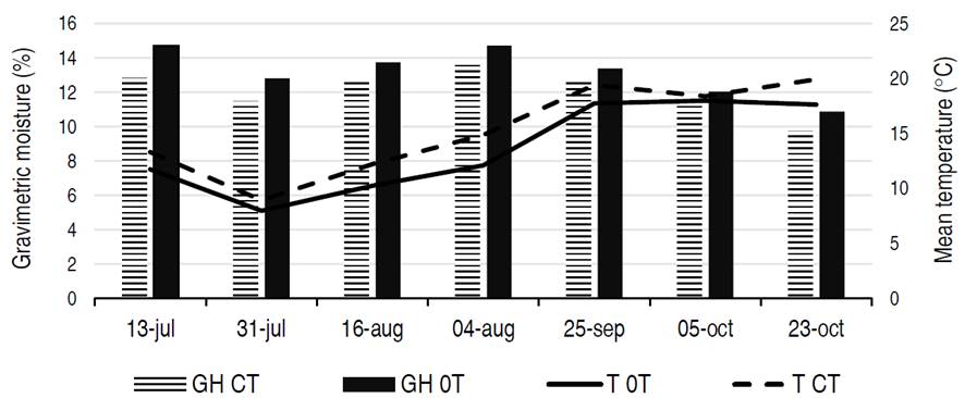As shown in Figure 3, in experiment 1 under 0T soil temperature was on average 3 °C lower and GH 2% higher. Records were similarly repeated in experiment 2 (data not shown). In soils prepared for planting, lower temperature and higher moisture are normally cited in 0T systems relative to CT, primarily because plant residues remain on the surface (Tuesca et al. 2001).