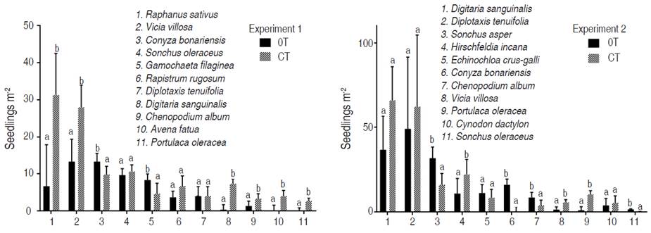 Figure 4: Density (seedlings m-2) of weeds in experiments 1 and 2 under conventional tillage (CT) and no-tillage (0T). Different letters indicate differences in the density of a given species between tillage systems according to Tukey's test (P<0.05).
