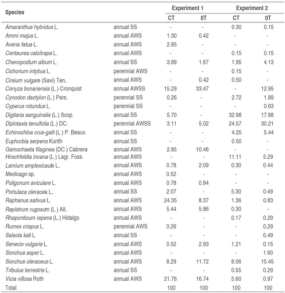 In both experiments, the total density of emerged weeds was higher under CT (P<0.05), being on average 386 (CT) and 239 (0T) seedlings m-2 in experiment 1 and 201 (CT) and 170 (0T) seedlings m-2 in experiment 2. There were mainly annual broadleaf species, varying the dominant weeds between experiments and between systems (Table 1).