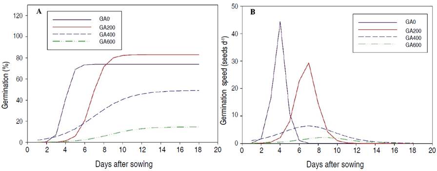 For germination behavior, a logistic model was adjusted at all concentrations (Figure 2 and Table 1). The seeds of the control treatment were characterized by rapid germination during the first seven days, at which time 73.88% of the seeds germinated. The highest speed (44.37 germinated seeds d-1) was obtained four days after sowing. Afterward, germination remained more or less stable until 18 days. With 200 mg L-1 of GA3, the germination began two days later, but the final germination was similar, with a high germination speed for several days. With 600 mg L-1, the percentage and speed of germination were significantly lower throughout the study (Figure 2).