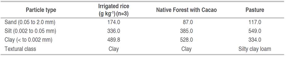 The study was conducted in the Zulia River Irrigation District in the rural area of Cucuta, Colombia. The site has a mean annual temperature of 29 °C, the mean annual precipitation is 1,900 mm, and the climate is classified as Tropical Dry Forest, according to Holdridge (IGAC 2006a). On the same farm, located at 8°10' 22.4" N and 72°29' 03.5" W, and at an altitude of 80 meters above sea level (masl), three different soil agricultural use and management fields were selected, delimited, and characterized according to their uses: irrigated rice (IR) cultivation, native forest with cocoa (FC), and pasture (P). According to IGAC (2006a), the selected fields are in a soil classified as Typic Udifluvents.