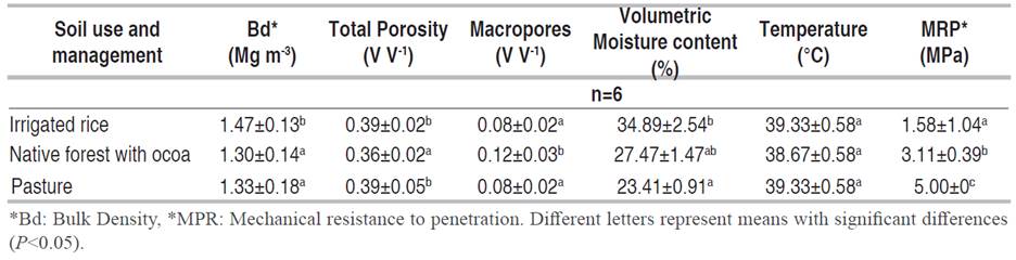 However, the evaluation of the soil's physical properties evidenced a degradation in the soil used with IR because of management practices such as tillage with flooding, which generate compaction of the soil, resulting in high Bd and low MPt (Table 2) as other studies have reported (Ruiz et al. 2005; Valenzuela et al. 2015). The soil in P uses evidenced compaction generated by the trampling of animals during the grazing process (Medina 2016).