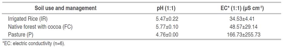 The electrical conductivity results in the soil of the three use systems showed values between 34.53 and 166.73 µS cm-1 (Table 3), indicating no salinity problems.