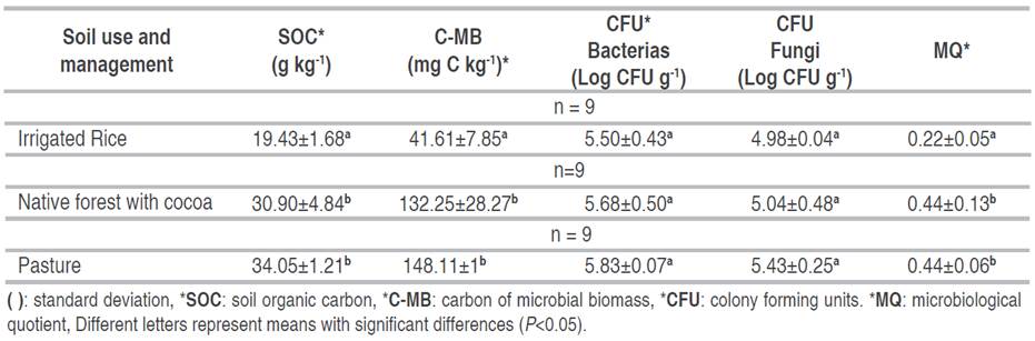 According to the results of this study, soils with less anthropic intervention and in which a permanent plant cover exists, such as the use of forest with cocoa and pasture, presented the highest soil organic carbon content, which favored the presence of microorganisms in the soil, evidenced by a higher carbon content of microbial biomass. This also coincides with better soil physical conditions, expressed by bulk density and macroporosity.