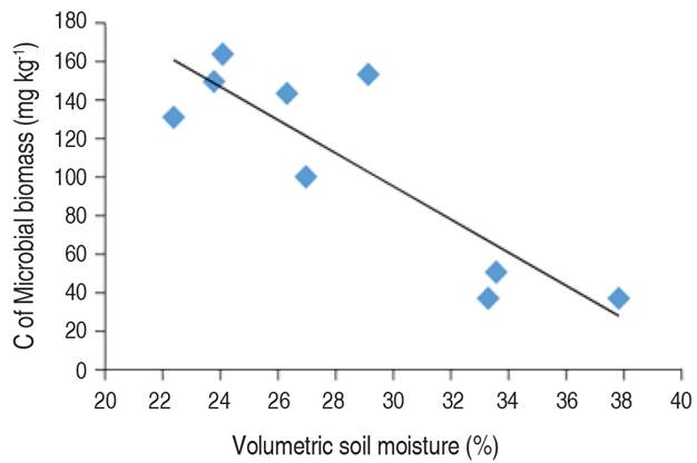 In Figure 4, it was evident that increases in soil moisture content are related to marked decreases of C-MB, which can be explained considering that the excess of water in soil displaces the air and, with this, the availability of O2 for the microorganisms, reducing their survival, (Siebielec et al. 2020; Visconti and Valenzuela 2023).