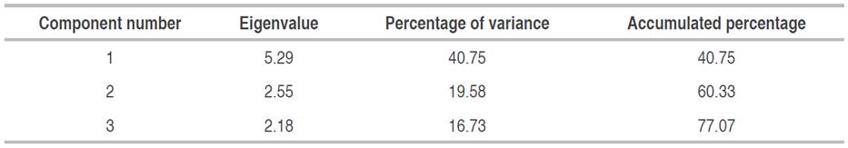 The analysis of principal components for the variables measured in this study has allowed us to interpret that the thirteen variables are grouped into three main parts capable of explaining 77.07% of the variability in the data (Table 5).