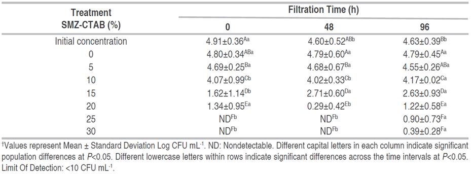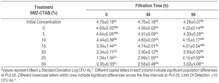 Table 3: Salmonella enterica serotype cocktail counts† in PBS after filtration through SMZ-CTAB.