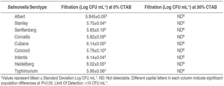Table 2: Salmonella serotypes counts† in PBS after filtration through SMZ-CTAB.