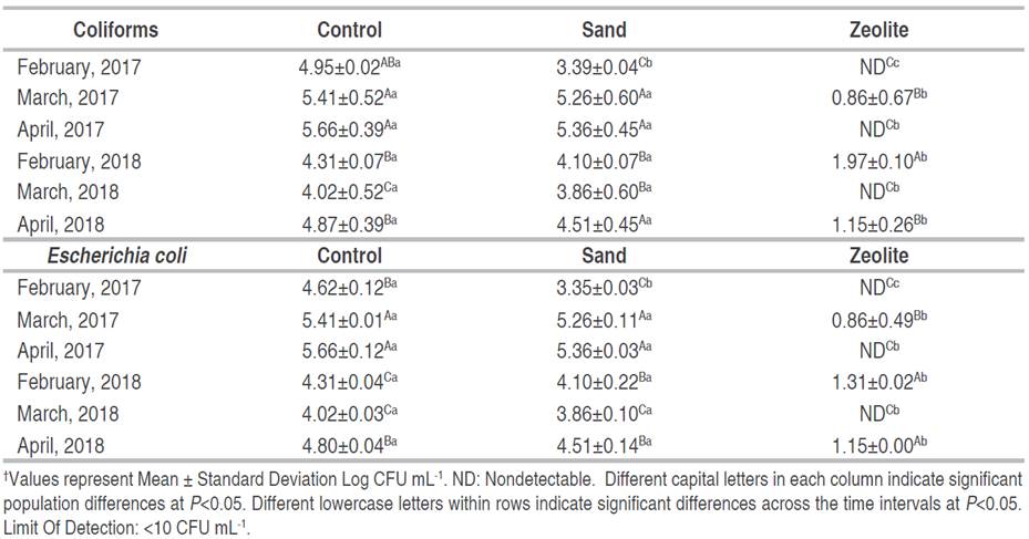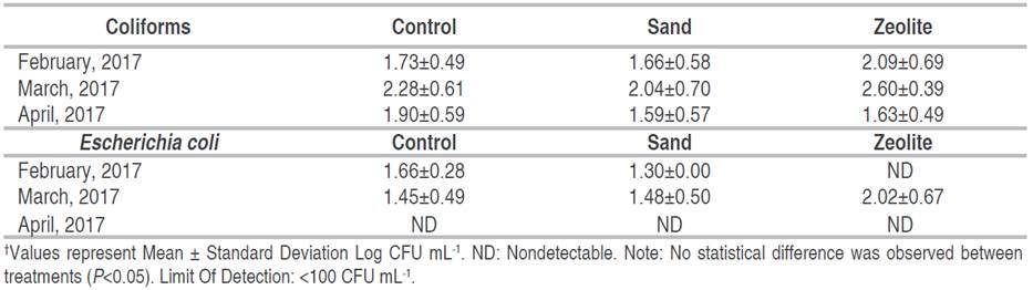 Table 5: Coliform and Escherichia coli removal in pond water filtered through sand and 20% SMZ-CTAB: Petrifilm method.