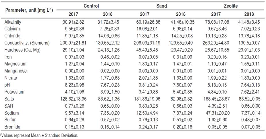 A comprehensive view of the chemical profile of irrigation water post-filtration for 2017 and 2018 in Table 7 displays how distinct parameters like alkalinity exhibit variations when processed through the zeolite system, potentially highlighting the ion-exchange properties of SMZ-CTAB. Notably, bromide levels remained low, suggesting no noticeable leaching of bromide post-filtration. However, the analysis of variance shows that parameters between the two years were not statistically significant for any treatments (P<0.05). While zeolite filtration demonstrates the potential to modify the irrigation water's chemical attributes, these changes remain consistent across the years studied. Such consistency suggests that other external or design-related factors influence the slight variations observed. Further research would be beneficial to determine the long-term impacts of zeolite filtration on water quality and its subsequent influence on agriculture.