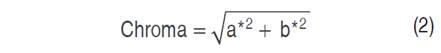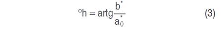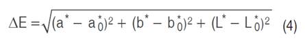 The color parameters CIELAB, L* (luminosity: 0-100); b* (color coordinate which indicates yellow + and blue -); a* (color coordinate which indicates red + and green -) were measured using a colorimeter (Konica Minolta, CR-400, Japan) previously calibrated (Y=89.5, X=0.3166, and Y=0.3347). The Chroma (equation 2), tone angle (h°) (equation 3), and color difference regarding dry spaghetti ΔE (equation 4) were calculated. /, / and / were measured in fresh spaghetti; and L*, a*, and b* were measured in dry spaghetti.