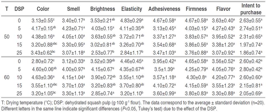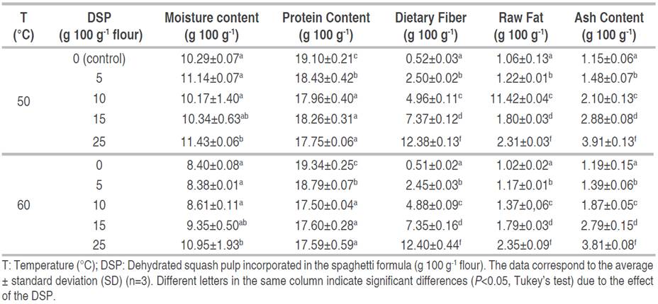 Regarding the fracture stress and hardness, all the values obtained for each of the formulations were significantly different, being higher in the control formulation (σfrac=52.34 N·mm-2 and hardness=6.56 N). The formulation that was closest to the control was DSP-5 (σfrac=37.84 N·mm-2 and hardness=2.59 N). Lastly, the cohesiveness was significantly different in all the formulations, whereby DSP-15 was the closest formulation to the control. In Table 3 shows more clearly the texture parameters evaluated for dried and cooked samples in the function of the percentage of DSP and drying temperature. Independently of the drying temperature, the incorporation of DSP produced a 37% decrease in the breaking force of the dried spaghetti. On the other hand, when the drying temperature was elevated from 50 to 60 °C, a noticeable effect in breaking force was noted, which could be due to an increase in the denaturalization of the proteins, promoting the reticulation of glutenine and gliadine with disulfide bonds. In other words, more disulfide bonds are formed at higher temperatures. This strengthens the network, resulting in the product's characteristic rigidity (Ogawa et al. 2015).