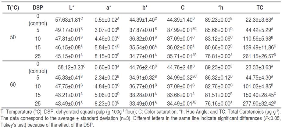 Analyzing the values of the a* coordinate that expresses the reddish tones for positive values, it was observed that this increases significantly with the addition of DSP, presenting the highest value in DSP-25. On the other hand, the b* coordinate that expresses yellow tones for positive values decreases significantly with increasing DSP, lowering the yellow tone. This behavior is related to the increase in total carotenoid content in the formulation, reaching a value of 269.52 µg g-1 for DSP-25. The above is reflected in the values of °h and Chroma, since °h decreases, approaching orange tones, and Chroma also decreases, meaning that the color reduces its purity (Table 2).