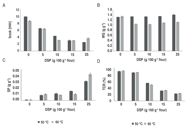 Similarly, the solids lost in the cooking water were 0.01 and 0.045 g g-1 (Figure 1C), lower than those reported by Minarovičová et al. (2018) (0.05-0.07 g g-1). These values are desirable for the pasta to be considered high quality (0.07-0.08 g g-1) (Añón 2007). Regarding the effect of DSP, it was noted that the solids lost in the cooking water were not significantly different from the DSP-5, DSP-10, and DSP-15 formulations. However, DSP-25 had a significantly higher value (0.045 g g-1).