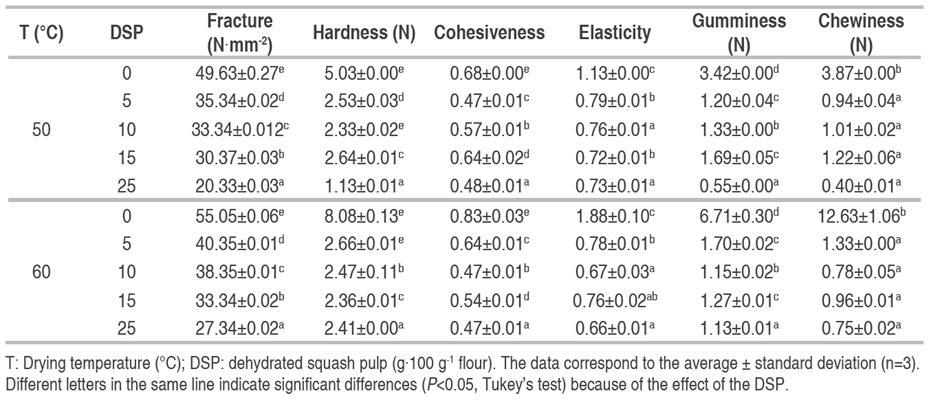 Texture is an important part of consumer acceptance and is one of the criteria that defines pasta quality. According to the analysis of variance, both temperature and the DSP had a significant effect (P<0.05) on all the texture variables and the interaction of both factors. Results showed that elasticity and gumminess were higher in the control formulation (DSP-0) (Table 3). The formulations closest to this value were those corresponding to DSP-5 and DSP-15. The other formulations were significantly less elastic and did not show significant differences (Table 3).