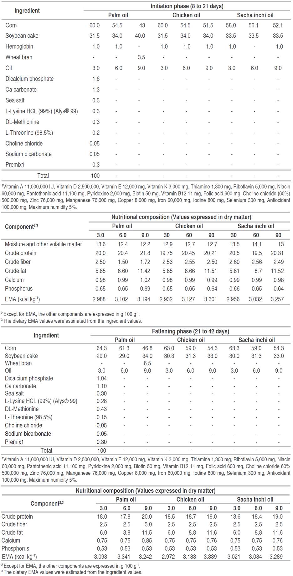 During the first week of life, the birds were offered a commercial diet. From day 8 of age to day 42, birds had voluntary access to the experimental diets according to the following pattern. Two evaluation phases were established. The first one, called initiation, was with birds aged between 8 and 21 days old. And the second one, fattening, was with birds aged between 22 and 42 days old. For both phases, the diets were in the form of flour and were designed following the requirements of Rostagno et al. (2017). Except for oils, the nutritional facts of the ingredients used in these diets were taken according to the information provided by the supplier. The apparent metabolizable energy values of the oils were estimated from a trial previously performed. In each phase, nine diets were provided to account for three oils (commercial palm, commercial chicken, Sacha inchi), and three inclusion levels (3, 6, and 9%) were offered at each stage. The centesimal and nutritional composition of the diets is shown in Table 1. The diets' chemical composition analyses were carried out in the chemical analysis and bromatological laboratory at Universidad Nacional de Colombia, which is registered as a quality control laboratory before the Colombian Agricultural Institute according to registration LB0000432021 (December 7, 2021).