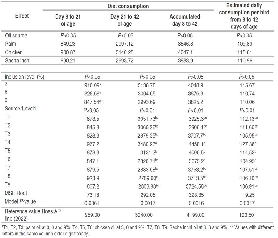 Table 2 shows the results of the diet consumption analysis during the following periods: from day 8 to day 21 of age, day 21 to day 42, the accumulated from day 8 to day 42, and the estimated daily average per bird. The comparison between the intakes recorded in the experiment versus the reference ones shows that besides some exceptions, the intakes in the experiment were below the performance objectives of the genetic line; highlighting the results regarding T4 (chicken oil at 3% inclusion), which were above those expected for the line. In the study, there was no consistent effect of the evaluated factors on consumption. For all evaluated periods, there was no oil source effect, nor the composition of its fatty acids, during the period from day 8 to day 21 of age; consumption declined with the increase in the inclusion level. In relation to the interactions between the source and the level of inclusion, it was possible to establish that the trends were similar during the period from day 21 to day 42 of age and between day 8 and day 42 of age: in both palm oil and Sacha inchi oil, the level of inclusion did not affect consumption; but regarding chicken oil, the highest consumption was achieved with 3% inclusion, with no difference between the two other levels.