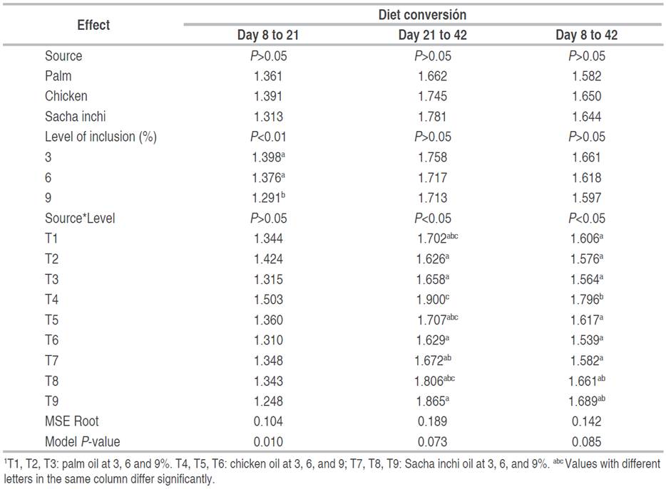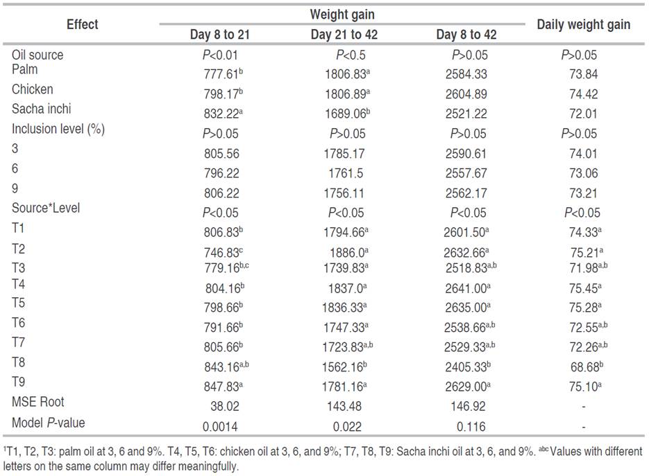 Regarding the level of inclusion of the oil sources evaluated, it has been established that there was no effect on this variable in all the periods evaluated; however, an effect on the interaction between the oil source and the level of inclusion was found. It was not possible to identify any type of trend in the effect of the interaction in the periods evaluated, suggesting that the birds' behavior had been independent with respect to the diet. Considering the above, the analysis will be focused on the period from day 8 to 42 of age and the daily weight gain of the entire experimental period. According to the results, the behavior in the three levels of inclusion of palm and chicken oils was similar, but there was a difference in the Sacha oil between 6 and 9%. If the analysis is performed by the level of inclusion at 3%, there is no difference between the three sources; at 6 and 9%, Sacha oil brought a difference in weight. Crespo and Esteve-Garcia (2001) in Ross 308 females evaluated comparing the one carried out in this study, a basal diet without added fat, and four diets with the addition of 10% of tallow (saturated fatty acids), olive oil (monounsaturated fatty acids), sunflower oil and flaxseed oil (polyunsaturated fatty acids) in a shorter period (between day 28 and 42 of age) than in this study. The results from the statistical analysis showed that the diets with the addition of different oils produced birds that weighed an average of 144 g more than those fed with the basal diet, but there was no difference between the diets with 10% fat added.