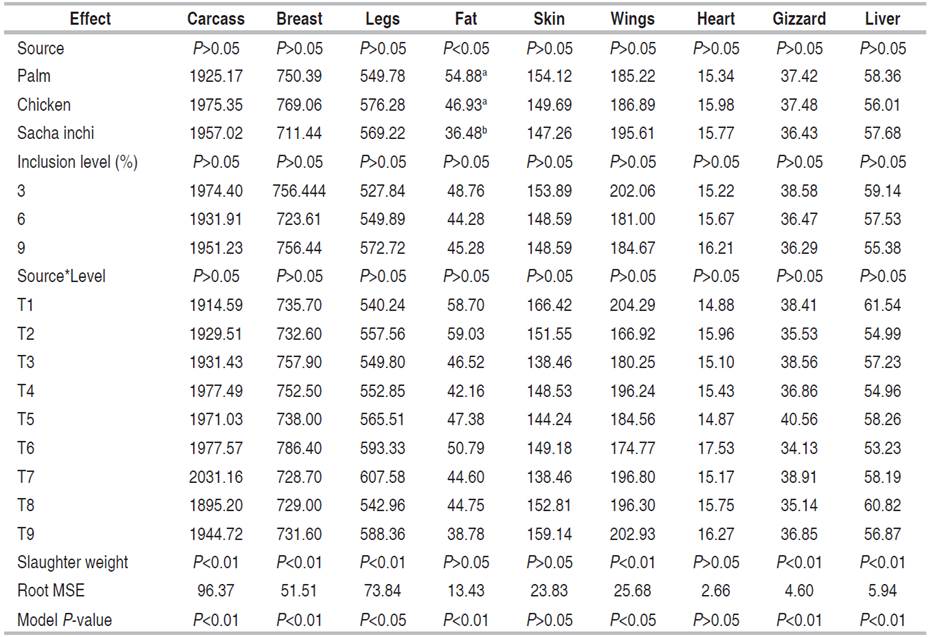 When naming some chicken organs and carcass components such as the slaughter weight rate (Table 6), the same trend is evident as in Table 5. That is, the oil source only affected the rate of abdominal fat weight. Both, the level of oil inclusion and the interaction between the source and the inclusion level, had no influence on the variables analyzed, and Sacha inchi oil produced carcasses with the lowest rate of abdominal fat in relation to slaughter weight, having no difference between the other two sources of oil evaluated.