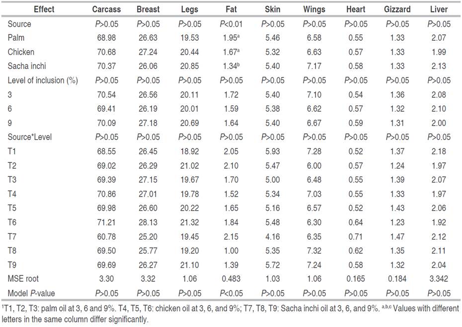 Table 4 shows the results of the analyses carried out for the diet conversion variable. The specific result of this study shows that the oil source did not affect the conversion variable, and there was only an effect of the oil inclusion level for the period between day 8 and 21 of age, and the interactions between the oil source and the inclusion level were only significant during the period between day 21 and 42 of age, including the overall period (between day 8 and 42 of age). According to the above, it was noted that the best feed conversion rate was obtained with the highest level of inclusion, without being different between the two previous levels of inclusion. As with the weight gain variable, it cannot be possible to identify any type of trend in the periods evaluated from the effect of the interaction, suggesting again that in each period there was independence in the behavior of the birds regarding the diet. For the fattening phase, from day 21 to 42 of age, there was no difference among the three levels of inclusion on the palm oil and Sacha inchi oil, but in chicken, oil the worst conversion was at 3% inclusion; in fact, the most limited conversions were obtained with T1 (3% palm oil), T4 (3% chicken oil) and T8 (6% Sacha oil), with no differences among them. At 6 and 9% there was no difference among the three oil sources. For the entire experimental period in palm and Sacha oil, there was no difference among the three inclusion levels, but for chicken oil the worst conversion was at 3% inclusion, at this level, there was no difference between palm and Sacha oils. Based on these results, it could be agreed that to improve the feed conversion rate, the use of oils with saturated and monounsaturated acids, such as palm and chicken oils, would require higher inclusion levels. Different story for polyunsaturated lipid sources such as Sacha inchi, since the conversion would be better at the inclusion level. Griffiths et al. (1977) reached different conclusions. These researchers conducted two experiments in male broilers to evaluate whether the fat sources (two mixtures of animal and vegetable fat, corn oil, and chicken oil) and the level of inclusion (at 0, 3, 6, and 9%) had an extra caloric effect and whether the system of expression of dietary energy - metabolizable or net - influenced the animal response or not. At eight weeks of age, birds fed with formulated diets based on the net energy system had carcasses with less fat and more protein.