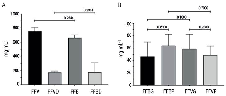 Figure 1: A. Total protein from cow (FFV) and buffalo (FFB) follicle fluid before (original) and after depletion (FFVD, FFBD, respectively). B. Total protein concentration in cows and buffaloes from big (>7 mm; FFVG, FFBG, respectively) and small follicles (<7 mm; FFVP, FFBP, respectively).