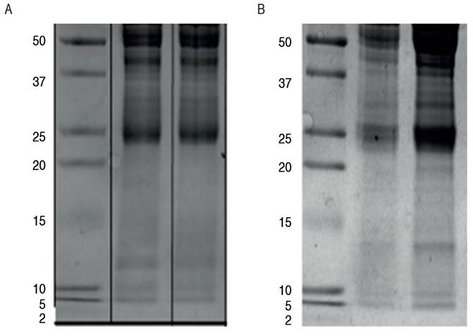Table 2 shows the number of proteins grouped by molecular weight within the categories analyzed. The qualitative results (relative % proportion of number of bands) did not coincide with the quantitative results (proportion of each band within the total). Proteins smaller than 20 kDa were not so abundant. In contrast, those between 20 and 6.0 kDa were more abundant.