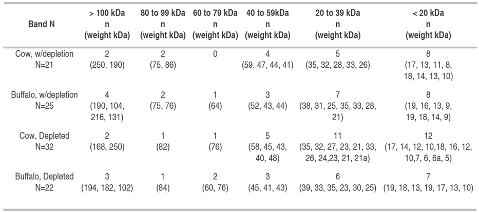 For protein banding patterns, more protein bands were identified in buffalo FF samples than in cow FF before depletion (25 vs. 21). However, after depletion, 34 protein bands were found in FF from cows vs. 22 from buffaloes. Neira-Rivera et al. (2020) found 25 bands in cows, a lower number than reported in this study.