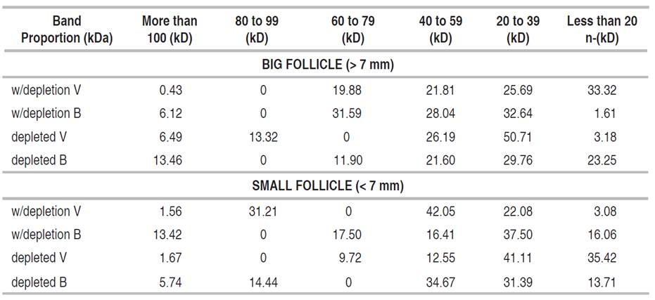 Several proteins have been identified in the FF, such as follicle-stimulating hormone (30 kD), inhibin (32 kDa), some growth factors (<30 kDa), transforming factor β (7.5 kDa), fibroblast growth factors (16-17 kDa), uterine serpins (52 kDa), albumin (62-69 kDa), immunoglobulins with their two heavy chains (50-70 kDa) and two light chains (23 kDa), transferrin (78-80 kDa), complement factors (31.8 kDa), gelsolin (80 kDa), arsenic methyl transferase (42.5 kDa), vitamin D (54.9 kDa), gelatinase B (91.5 kDa), lactotransferrin (78.05), and osteopontin (45 kDa) (Neira-Rivera et al. 2020). All these proteins perform some function in the development of the follicle, ovulation, or the atresia process. Many may be included in the protein bands found in this research, but this needs to be confirmed in future works using two-dimensional gel electrophoresis and mass spectrometry. It can be evidenced that the proteins of low molecular weight are those most associated with reproductive processes, while those of higher molecular weight correspond to the basal functions of the organism.