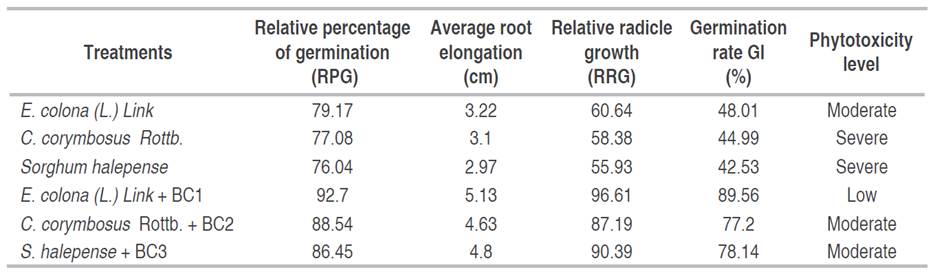 The level of phytotoxicity was from severe to moderate in the soil where the lead-tolerant weeds were grown for 90 days, and it was from moderate to low in the soil with the lead-tolerant weeds inoculated with the bacterial consortia. The soil where the highest germination rate of radish seeds was reached (89.56%), and therefore the lowest level of phytotoxicity (low) was that corresponding to E. colona (L.) Link with BC1 (Table 2).