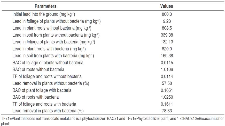 The lead content decreased in the phytoremediated soil with and without bacteria, a decrease previously reported by Lu et al. (2021) and Gorelova et al. (2022). At the end of the evaluation period of this study, 57.58% removal of the contaminant was reached in the soil of the plants where bacteria were not applied, and 78.83% when bacteria were applied. The range of percent lead removal is greater than the 13.01-31.89% reported by Lu et al. (2021) in soils contaminated with 2-5% lead and remediated with Artemisia capillaris and Plantago asiatica L.