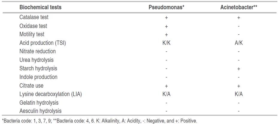 The identification of the genus of bacteria in the consortium was carried out by several biochemical like catalase, oxidase, motility, production of acidity from glucose on triple sugar iron (TSI) agar, reduction of nitrates to nitrites, hydrolysis of urea and starch, indole production, citrate utilization, lysine decarboxylation on lysine iron agar (LIA) and gelatin and esculin hydrolysis (Silva et al. 1999; Salazar and Nieves 2005; Álvarez-López et al. 2014; Dipak and Sinha 2017).