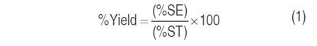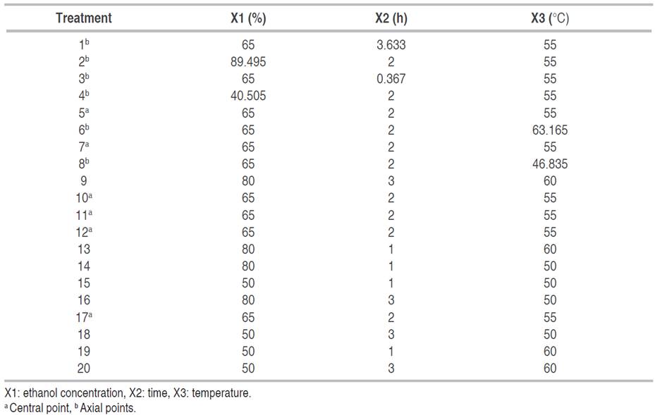 Quinoa husk was subjected to different extraction conditions by maceration method. The percentage of ethanol in the solvent (50 and 80%), temperature (50 and 60 °C), and extraction time (1 and 3 h) were the variables evaluated. The optimization study of the saponin extraction process was carried out by applying the response surface methodology (RSM), under a central composite design (CCD), for which two levels and three independent factors were defined, including ethanol concentration (X1), time (X2) and temperature (X3) in a factorial arrangement 23. The total number of experimental runs generated by the design was 20, with eight cube points, four central points in the cube, six axial points, and two central points in the axial (Table 1). For the axial points, an α=1.633 was used. The experiments were run randomly. The yield of extraction was calculated for the optimal conditions found by equation 1: