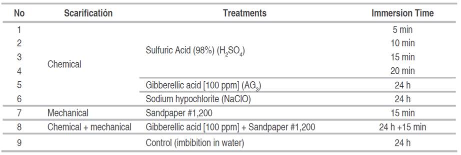 This study aim was to determine which scarification method stimulates the germination process to a greater extent. Different immersion times were evaluated, from 5 to 20 minutes in sulfuric acid, 24 hours in sodium hypochlorite, water and gibberellic acid, 15 minutes of treatment with sandpaper, and a combination of the last two.