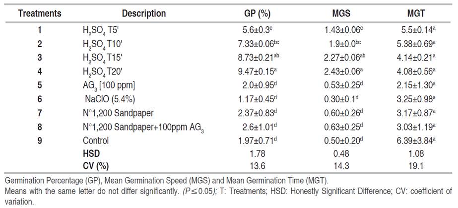 The 20 min immersion time in sulfuric acid (T4) was statistically superior in the variables Percentage and Mean Germination Speed with respect to the control and the seeds subjected to sodium hypochlorite, sandpaper #1200, gibberellic acid and the combination of the latter two.