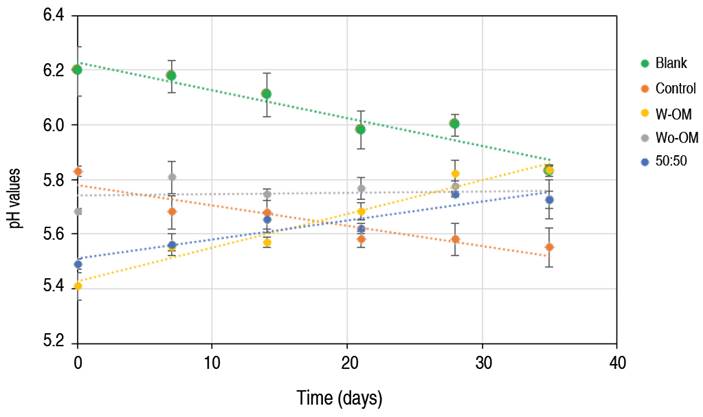 Figure 1 shows the effect of seashell type (W-OM, Wo-OM, and 50:50 treatments) on soil pH. The W-OM and 50:50 treatments showed an increasing trend of soil pH from pH values less than 6.5 (acidic range) to close to a neutral pH range (7.0±0.5) during the period analyzed. Similarly, other studies have reported higher pH values in paddy soils with organic matter content and/or calcium carbonate (Zhao et al. 2014). In general, the decomposition of organic matter leads to the production of more organic acids, thus lowering pH (Hong et al. 2019). However, organic acids produce calcium salts when it reacts with calcium carbonate (Luai et al. 2020), and, such salts, as calcium lactate, act as an antacid agent contributing to the pH upturn. The Wo-OM treatment showed a constant trend, probably due to the buffering capacity of the calcium carbonate contained in the seashells and the absence of organic matter (Ng et al. 2022). On the other hand, the blank and control treatments exhibited a decreasing trend in soil pH; in the first case, as leaf soil is an organic medium, the soil pH could decrease when it comes into contact with irrigation water, due to the soluble organic acids it contains (Adeleke et al. 2017), and, in the second case, the alluvial soil of the area under study was made up of rocks with acid reaction, such as, granites and siliceous sandstones, which give soils with pH between 4.8 and 5.6 (Li and Shi 2020).