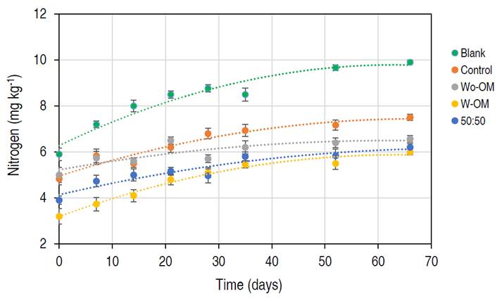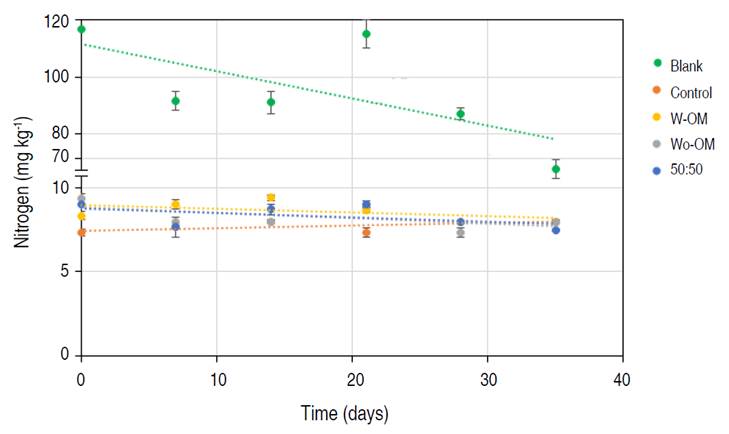Figure 2 shows the effect of W-OM, Wo-OM and 50:50 treatments on soil N level, which was approximately 9 mg kg-1, during the 35 days analyzed. Considering that during fertilizer preparation, the N level incorporated into soil was adjusted to 19 mg kg-1 and, given that the coffee bean (CB) waste had a severe heat treatment applied during its house preparation, therefore, it could be suggested that not all the nitrogen was available for the plant, probably, due to a protein denaturation in CB (Mazzafera et al. 2019). Additionally, given the low absorption of N, root differentiation and expression of nitrate transporters could have been affected, altering plant quality (Singh et al. 2022). Visually, this was verified because a lower number of shortened plants was found (n=3), that is, a greater leaf opening was observed in the plants (n=9), which promoted leaf dehydration (Blanco and Martínez 2019). For its part, the control treatment showed a low N level (5.8±0.1 mg kg-1), which allowed the improvement of N in the soil with the W-OM, Wo-OM, and 50:50 treatments. The blank treatment showed the highest N level, 102.6±9.2 mg kg-1, which can be explained because the leaf soil was formulated by plant and forestry waste, which represent the largest nitrogen reserve in the soil and most of this nitrogen can be available to the plant.