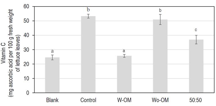 Figure 5: The vitamin C content in lettuce leaves. Blank: lettuce plant in leaf soil; Control: lettuce plant in alluvial soil; W-OM: lettuce plant in alluvial soil more seashells with organic matter; Wo-OM: lettuce plant in alluvial soil more seashells without organic matter, and 50:50: lettuce plant in alluvial soil more a mixture of equal masses of W-OM and Wo-OM.