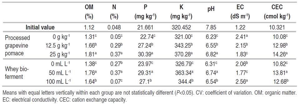 Table 2: Effect of the application of processed grapevine pomace and whey bio-ferment on the chemical characteristics of the soil at crop harvest.