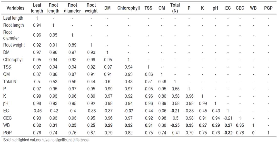 The results obtained in the crop evaluations showed significant differences in the effects of the treatments applied, both at the level of the main effects and interaction levels (Table 4). To analyze the effects of PGP and WB, the results are shown at the main effects level. The application of biofertilizers was found to improve crop features in comparison to absolute control, based on the benefits identified in the soil characteristics. (0 g PGP, 0 mL WB) (Figure 1). Regarding PGP doses, a strong directly proportional relationship was found with the variables leaf length (P<0.0001), chlorophyll (P<0.05), length (P<0.05), diameter (P<0.05), weight (P<0.05), DM (P<0.05), and TSS (P<0.05) of the root. In the case of WB, although correlations were positive in all cases (minimum R2 0.25 and maximum 0.38), they were not significant (Table 3). These results correlate fairly well with Ramírez and Pérez (2006) and Mali et al. (2018), who concluded that applying organic fertilizers and biofertilizers affects crop growth directly, development, and production.