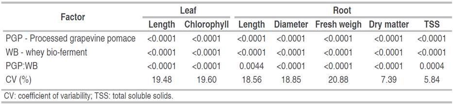 Table 4: Results of the P value of the main effect of processed grapevine pomace, whey bio-ferment and their interaction on characteristics in radish crop (analysis of variance - ANOVA).