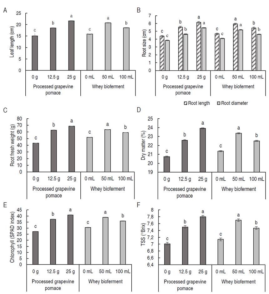 Figure 1: Main effects of the application of processed grapevine pomace (g kg-1) and whey bio-ferment (mL L-1) on A. leaf length, B. leaf chlorophyll (SPAD index), C. root dry matter (%), D. root length and diameter, E. root fresh weight, and F. root total soluble solids TSS. Means with equal letters between columns of the same color are not statistically different (P<0.05).