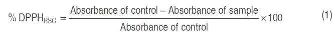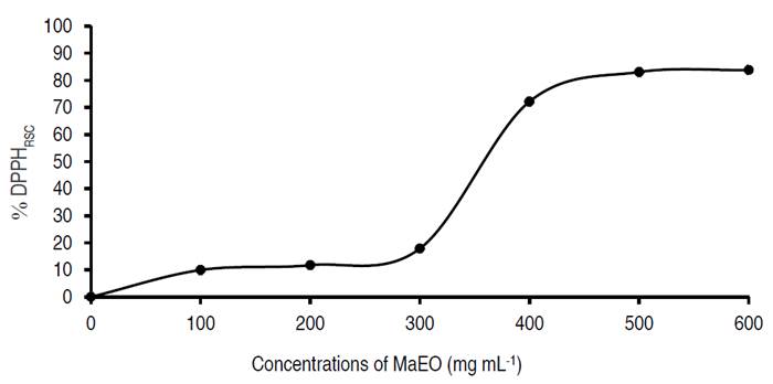 The AC of MaEO was determined using DPPH assay according to the procedure described by Rahman et al. (2015) with some minor corrections. EOs were diluted into concentrations (100, 200, 300, 400, 500, and 600 mg mL-1) in 96% ethanol. 0.3 mL of the obtained EO and 3.7 mL DPPH 0.1 M in 96% ethanol solution were mixed. The mixture was kept in dark conditions for 30 min at room temperature. DPPH radical scavenging capacity (DPPHRSC) of MaEO was expressed by the degree of color reduction of the DPPH solution, as determined by measuring the absorbance at a wavelength of 517 nm, and antioxidant capacity was calculated following equation 1, while vitamin C was used as a control. Percent inhibition plotted against EO concentration to estimate concentration gives 50% inhibition (IC50).