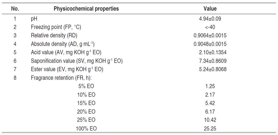 MaEO is a light-yellow liquid with a characteristic odor and a bitter taste. The physicochemical properties of EO are shown in Table 1. The pH value of MaEO is about 4.94 and this result is higher than that in some EOs from other materials, such as Melaleuca cajuputi leaves (pH=4.46) (Quoc 2021) and Ceratonia siliqua pulp (pH=4.3) (Ouis and Hariri 2018). The chemical component of EO affects pH strongly, leading to a significant difference in pH in materials.