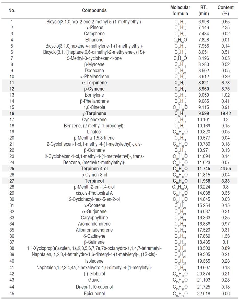 The volatile compounds of MaEO were analyzed by GC-MS. The results are displayed in Table 2. A total of 45 compounds were identified and quantified in the EO isolated from the M. alternifolia leaves; they account for 99.35% of the oil and are tested by retention times ranging from 7 to 22 min. Compounds comprising the highest content in MaEO, include Terpinen-4-ol (44.55%), γ-Terpinene (19.42%), p-Cymene (8.75%), α-Terpinene (6.73%), and Terpineol (3.33%). These components play an important role in the quality of MaEO and there is variation in the chemical composition of EO from tea tree leaves collected in different regions. In previous studies, authors also used the distillation method to extract EOs from the initial material. For example, MaEO isolated from Tien Giang province (Vietnam) possess 19 volatile components: Terpinen-4-ol (36%), γ-Terpinene (17.8%), 1,8-Cineole (10%), etc. (Hòa et al. 2016), while MaEO from Slovakia has 47 identified components, including Terpinen-4-ol (40.3%), γ-Terpinene (11.7%), 1,8-Cineole (7%), p-Cymene (6.2%), etc. (Borotová et al. 2022), and while MaEO collected in Thailand has 24 components, including Terpinen-4-ol (30.42-34.76%), γ-Terpinene (25.08-26.23%), α-Terpinene (12.31-12.43%) and 1,8-Cineole (5.99-9.08%), etc. (Sukatta et al. 2011). In this study, the main component of MaEO is Terpinen-4-ol and its content is higher than that in MaEO from other places. The MaEO from the Lam Dong province complied with the ISO 4730 (2017) standard analysis with few variations in the contents of major constituents. This difference in the chemical composition of MaEO can be explained due to different extraction methods, climatic conditions, harvesting periods, genes, etc.