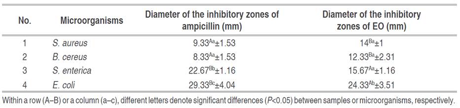 The AA was determined by susceptibility testing by the agar plate diffusion method described by Quyen and Quoc (2023) with minor adjustments. First, a sterile spreader spread 100 μL of bacterial suspension (0.5 McFarland standard, approximately 1.5×108 CFU mL-1) onto Muller-Hinton agar medium (MHA). Then, paper plates with a diameter of 6 mm were impregnated with essential oils (5 μL) put on MHA media, while ampicillin (10 μg disc-1) and 5% dimethyl sulfoxide (DMSO) solution (5 μL disc-1) were used as a positive and negative control. Petri dishes were incubated for 24 h at 37 °C, and the diameter of the inhibition zone was measured in mm.